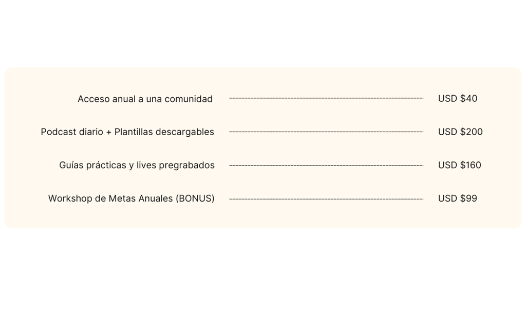 Este sería el valor total de cada elemento si se vendiera por separado, y fácilmente podría costar mucho más, ya que es un programa de desarrollo profesional, acompañamiento y crecimiento real para nuevos líderes.